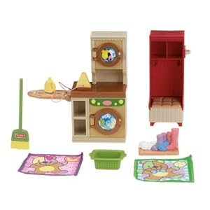 A beautifully equipped laundry room makes cleaning chores LOTS more fun! The stacking washer and dryer both have opening doors. The ironing board flips up for quick touch-ups, and the storage cubby has a lift-up seat. Plenty of accessories, plus two soft blankets for the baby twins! All sized just right for any Fisher-Price® Loving Family¿ dollhouse.